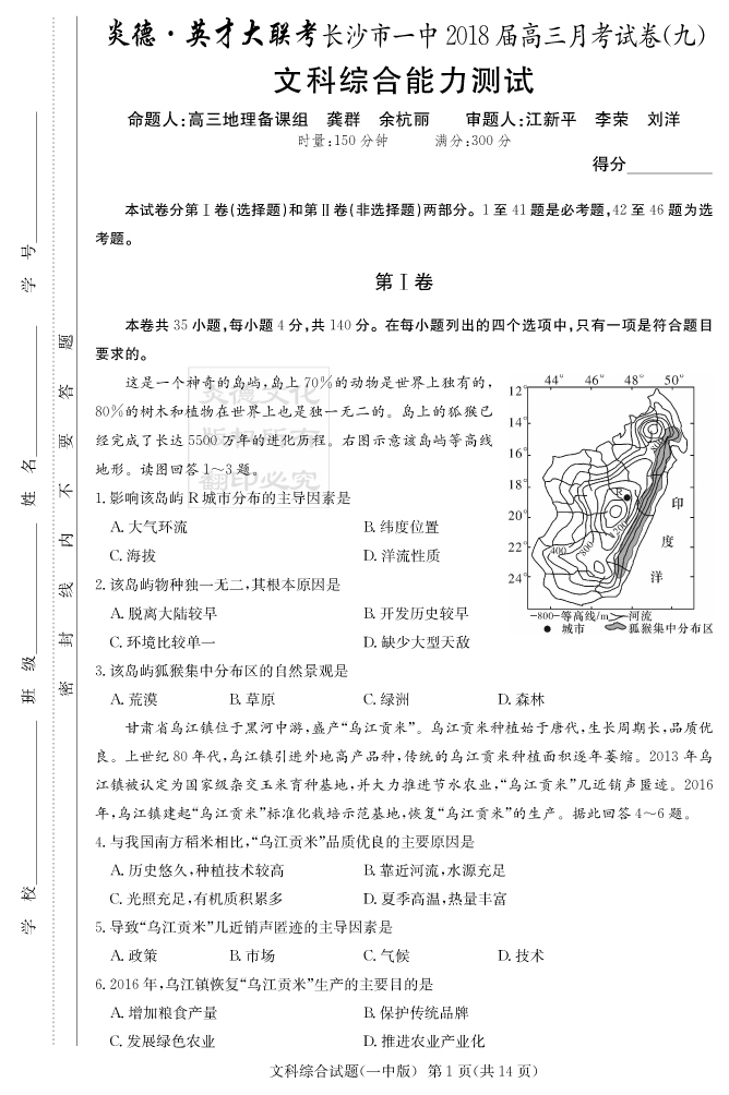 【文綜】炎德英才大聯考2018長沙一中高三9次月考